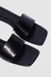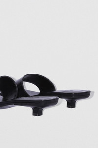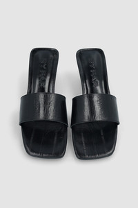 Embossed leather slip-on with a tonal painted kitten heel (3 cm), a single leather strap, and a contrast insole. Features a square toe and back. Made from LWG-certified leather. DETAILS - Leather slip-on - Tonal painted kitten heel - Heel Height: 3 cm - One leather strap - Contrast insole - Square toe and back - Made in Bulgaria SIZE AND FIT Fits true to size. Italian/European sizing