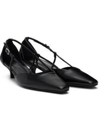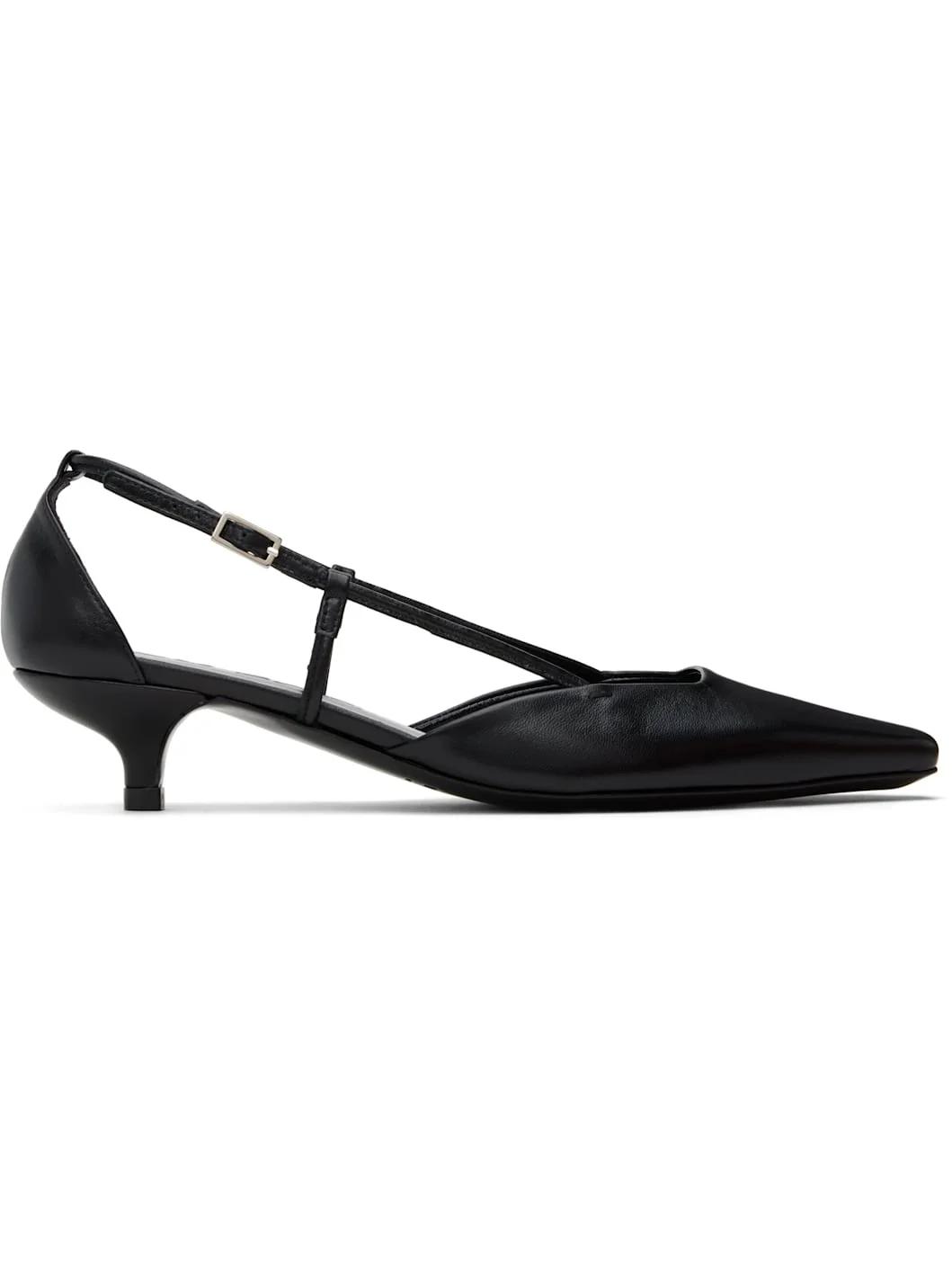 Polished lambskin heels in black. · Pointed square toe · Straps at sides · Pin-buckle fastening at outer side · Logo embossed at padded leather footbed · Covered kitten heel with rubber injection · Polished leather sole · Heel: H1.5" Supplier color: Black Upper: lambskin. Sole: leather. Made in Portugal 242289F122006