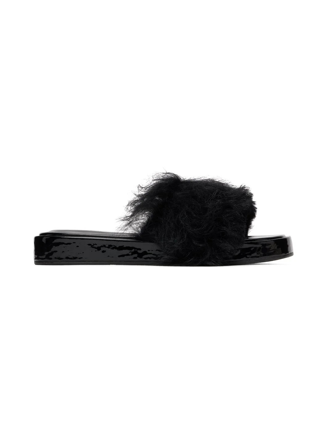 Patent lambskin flat sandals in black. · Open square toe · Faux-fur trim at vamp · Logo embossed at padded footbed · Covered midsole · Treaded rubber outsole Supplier color: Black Upper: lambskin, textile. Sole: rubber. Made in Portugal 222289F124005