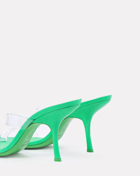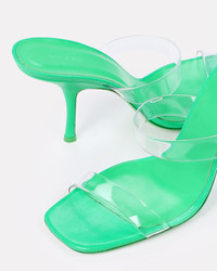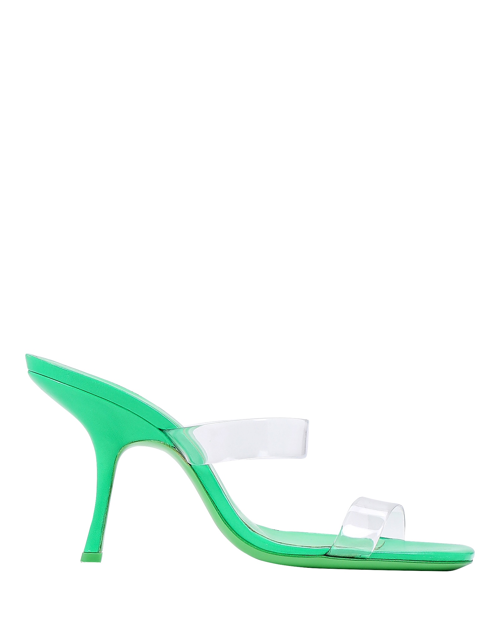 Product Details The label's Clara sandals in vibrant green leather complemented by PVC straps for a barely-there look. Leather-covered stiletto heels. - Composition: leather, PVC - Heel height: 4" - Imported