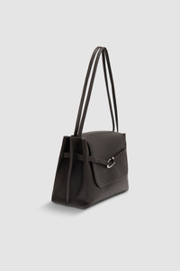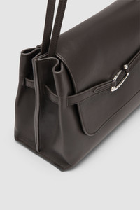 Soft nappa leather tote bag featuring an adjustable belt detail with a custom metal buckle. Designed for versatility, it can be worn over the shoulder or crossbody. The interior includes two large compartments, a middle pocket, and a branded leather patch pocket. Fits a 13-inch laptop. Finished with micro suede lining. DETAILS - Soft tote bag; flap bag - Leather shoulder straps - Option to wear it crossbody - Two large interior compartments and one middle pocket - Adjustable belt detail with custom metal buckle - Large interior branded leather patch pocket 183x90mm - Micro suede lining - Made in Bulgaria SIZE AND FIT - Height: 21 cm - Width: 30 cm - Depth: 12 cm - Handle Drop: 25 cm - Strap Length: 70 cm