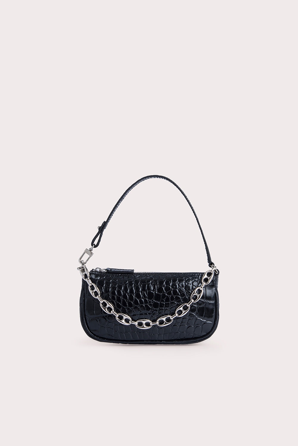 Playing with proportions, BY FAR reintroduced its iconic shape into a compact mini version. The minimalist silhouette stands out for its sleek lines and the custom silver-toned chain on the front, inspired by vintage jewellery. MINI RACHEL can fit just the essentials, including a phone. The feminine appeal of the style is further enhanced by the croco embossed leather, a signature material for the brand.