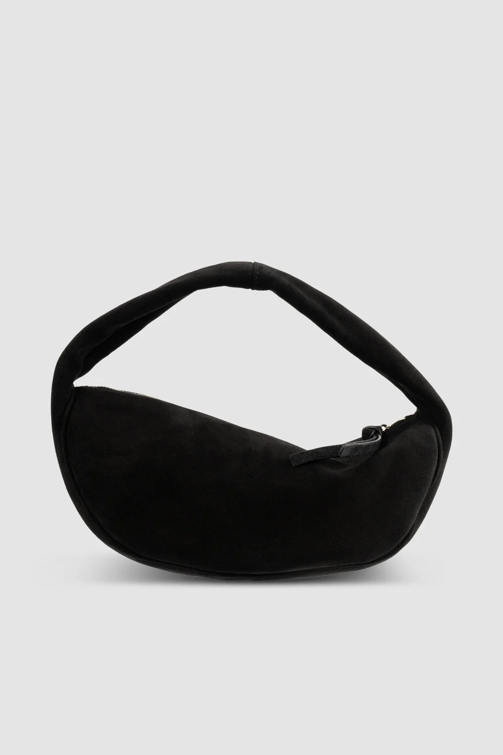 Suede cowhide leather shoulder/top handle bag with a slouchy crescent silhouette and a single soft wide shoulder strap. Features a zip closure with leather pull, black synthetic suede lining, and an interior patch with raised logo. DETAILS - Shoulder/top handle bag - Slouchy crescent silhouette - Single soft wide shoulder strap - Zip closure with leather pull - Black synthetic suede lining - Inside Patch 63x56mm with 45mm raised logo - Made in Bulgaria SIZE AND FIT - Depth: 10cm - Height: 13cm - Width: 30cm - Handle Drop: 11cm (measured flat) - Strap Length: 37cm