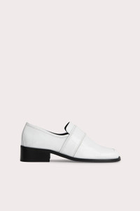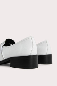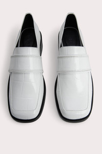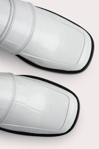 The Cyril slip-on refines the penny loafer to its essence. The classical silhouette has a leather saddle, square toe and is accented with exposed hand stitching, borrowed from the menswear classic. It is made from maxi croco embossed leather – Italian cowhide with an exaggerated crocodile print that brings a fresh take to the signature BY FAR texture. DETAILS - Italian cowhide leather - Low stacked heel - Delicate piping - Square toe - Heel height: 4 cm - Made in Portugal SIZE AND FIT Fits true to size. Italian/European sizing