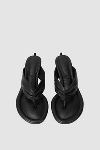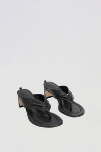 Lambskin leather flip-flop heel sandal with gathered leather straps, round toe, and a 5.5 cm heel. Features a cushioned footbed with topstitching and an ankle bracelet. DETAILS - Leather flip-flop heel sandal - Cushioned footbed with top stitching - Gathered leather straps - Round toe - Heel height: 5,5cm - Made in Portugal SIZE AND FIT Fits true to size. Italian/European sizing.