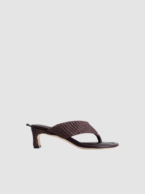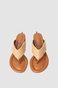 Raffia and leather flip-flop heel sandal with gathered leather straps, round toe, and a 5.5 cm heel. Features a cushioned footbed with topstitching and an ankle bracelet. DETAILS - Leather flip-flop heel sandal - Cushioned footbed with top stitching - Gathered leather straps - Round toe - Heel height: 5,5cm - Made in Portugal SIZE AND FIT Fits true to size. Italian/European sizing.