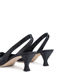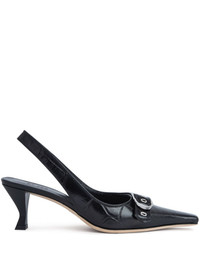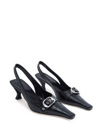 BY FAR’s Evita slingback is made of Italian cowhide leather and decorated with a buckled strap along the upper that creates cool interest. The pointed-toe silhouette is completed with a sculpted kitten heel. DETAILS - Cowhide leather - Sculpted kitten heel, covered in leather - Heel height: 6,5 cm - Metal hardware on the upper - Almond toe - Made in Portugal SIZE AND FIT Fits true to size. Italian/European sizing