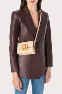 Decorated with the BY FAR logo in gold, the Fran mini bag has a classic box shape and a structured interior. The top-handled style is crafted in semi patent leather, a material that is distinctive in the brand’s collections. With an adjustable shoulder strap in matching leather, it can be worn as a crossbody or shoulder bag. DETAILS • Cowhide leather exterior • Adjustable, detachable leather handle • Additional adjustable leather strap • Branded hardware • BF logo on the flap • Single interior pocket • Made in Spain CARE At BY FAR we carefully select all materials used for our products. Please handle with care for longer product life. • Avoid use in very humid conditions and against light coloured garments • Avoid contact with rough and/or abrasive surfaces • Do not use solvents and excessive or prolonged rubbing, as this could damage the product • Clean with a soft, dry cloth • Store your BY FAR product in its original dust bag You can find more information at Product Care. SIZE AND FIT • Depth 8cm • Height 12cm • Width 16cm • Handle drop short strap 10cm • Handle drop long strap 43cm