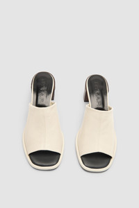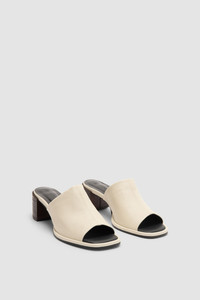 Leather mule with a soft fit and elasticated topline, featuring a stacked 5cm block heel with a dark brown leather border. Designed with contrast piping, a central seam, square toeshape, and a leather-covered toeline border. Finished with a leather sole. DETAILS - Leather mule - Soft fit, elasticated topline - Stacked leather block heel with 3mm border; dark brown on all colourways - Heel height - 5cm - Contrast piping - Central seam - Square toeshape - Leather covered border around the toeline - Leather sole - Made in Bulgaria SIZE AND FIT Fits true to size. Italian/European sizing.