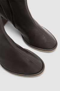 Lamb nappa leather ankle boot with an unlined upper and a glove-like fit, featuring an internal side zip closure and central seam. Finished with a 5cm leather-covered block heel with a 3mm border, round toeshape, and a crepe rubber and leather sole. DETAILS - Leather ankle boot - Unlined upper - Glove-like fit - Internal side zip closure - Leather-covered block heel with 3mm border - Heel height - 5cm - Central seam - Round toeshape - Leather covered border around the toeline - Crepe rubber & leather sole - Made in Bulgaria SIZE AND FIT Fits true to size. Italian/European sizing.