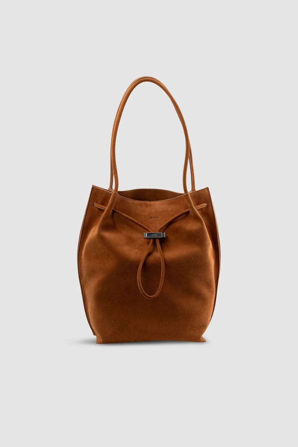 Soft suede cowhide leather tote bag with a wide base, tubular shoulder straps, and an adjustable chain with custom toggle closure. Features branded metal hardware, micro suede lining, a large interior branded leather patch pocket, and external BY FAR branding. DETAILS - Soft tote bag with wide base - Tubular leather shoulder straps - Adjustable chain and custom toggle closure - Branded metal hardware - Large interior branded leather patch pocket 183x90mm - Micro suede lining - External BY FAR branding - Made in Bulgaria SIZE AND FIT - Height: 32 cm - Width: 22 cm - Depth: 11 cm - Handle Drop: 22 cm - Strap Length: 53.5 cm