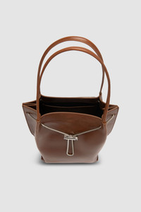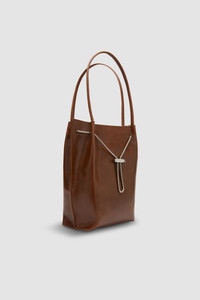 Soft tote bag featuring a wide base and tubular leather shoulder straps. Designed with an adjustable chain and custom toggle closure, accented by branded metal hardware. Interior includes a large branded leather patch pocket and is lined with soft micro suede for a refined finish. DETAILS - Soft tote bag with wide base - Tubular leather shoulder straps - Adjustable chain and custom toggle closure - Branded metal hardware - Large interior branded leather patch pocket 183x90mm - Micro suede lining - Made in Bulgaria SIZE AND FIT - Height: 32 cm - Width: 22 cm - Depth: 11 cm - Handle Drop: 22 cm - Strap Length: 53.5 cm