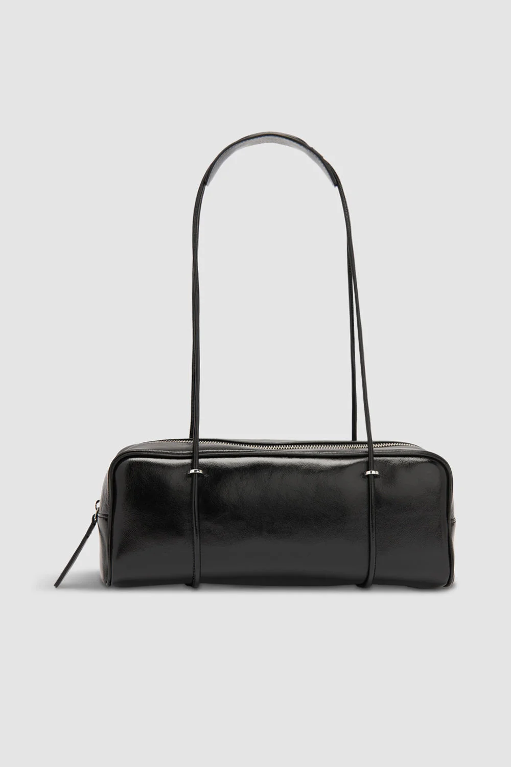 Glossy textured leather baguette bag with oversized soft construction and tubular leather shoulder straps. Features a zip closure and a spacious interior compartment, complemented by a small branded leather patch pocket (credit card size). Finished with micro suede lining. DETAILS - Baguette bag; oversized soft construction - Tubular leather shoulder straps - Zip closure - One big interior compartment - Small interior branded leather patch pocket 100x 60mm (credit card size) - Micro suede lining - Made in Bulgaria SIZE AND FIT - Height: 12,5 cm - Width: 31 cm - Depth: 10 cm - Handle Drop: 27 cm - Strap Length: 67 cm