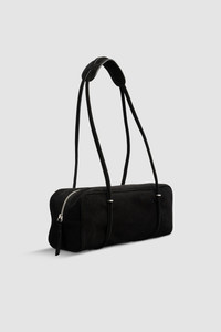 Suede leather baguette bag with oversized soft construction and tubular leather shoulder straps. Features a zip closure and a spacious interior compartment, complemented by a small branded leather patch pocket (credit card size). Finished with micro suede lining and external BY FAR branding. DETAILS - Baguette bag; oversized soft construction - Tubular leather shoulder straps - Zip closure - One big interior compartment - Small interior branded leather patch pocket 100x 60mm (credit card size) - Micro suede lining - External BY FAR branding - Made in Bulgaria SIZE AND FIT - Height: 12,5 cm - Width: 31 cm - Depth: 10 cm - Handle Drop: 27 cm - Strap Length: 67cm