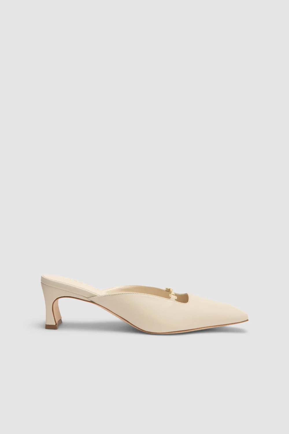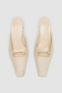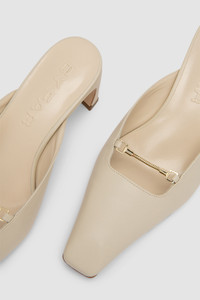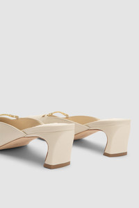 Lamb nappa leather mule with a sculpted 5.5cm leather-covered block heel, low square topline, and square toeshape. Finished with a chain detail and a leather sole. DETAILS - Leather mule - Sculpted leather-covered block heel - Heel height: 5,5cm - Low square topline - Square toeshape - Chain detail - Leather sole - Made in Bulgaria SIZE AND FIT Fits true to size. Italian/European sizing.