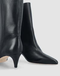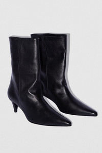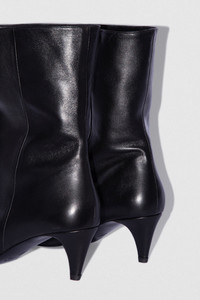Lamb nappa leather ankle boots with a 6 cm covered conical heel and a relaxed mid-calf pull-on design. Finished with a pointed toe made from LWG-certified leather. DETAILS - Slouchy leather boot - Crafted in soft Italian lambskin - Leather-covered conical heel - Heel Height: 6 cm - Pull-on mid-calf length upper - Pointed toe - Made in Bulgaria SIZE AND FIT Fits true to size. Italian/European sizing