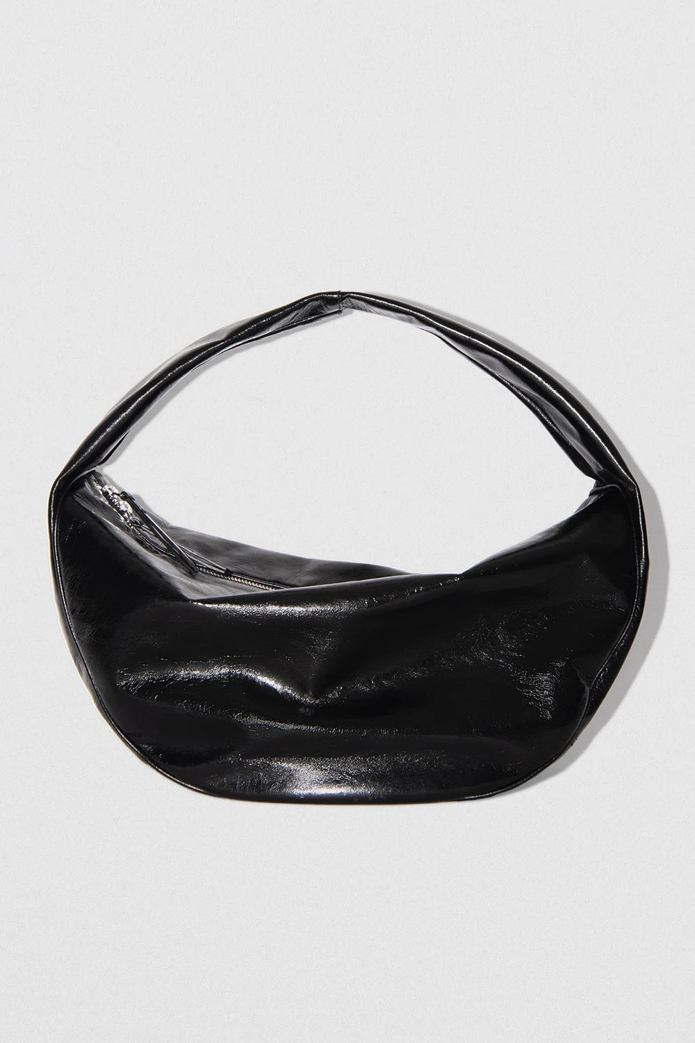 Creased leather shoulder bag with a slouchy silhouette, single strap, and zip closure. Features black cotton lining, an inside pocket, and a raised logo patch. The style is from LWG certified leather. DETAILS - Leather shoulder bag - Crafted in soft Italian lambskin with a glossy finish - Slouchy silhouette - Single shoulder strap - Zip closure - Black cotton lining - Inside zip pocket - Made in Bulgaria SIZE AND FIT - Handle drop: 18 cm - Strap: 48 cm - Width: 40 cm - Height: 25 cm - Depth: 15 cm