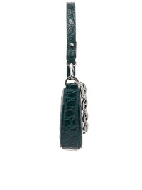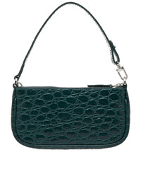 BY FAR bag in dark green, circular croco embossed, custom silver-toned chain inspired by vintage jewelry, nickel-free zamack base metal hardware, zip closure, edge painting details, lined. Made in Bulgaria Composition: (Main) 100% Cowhide Leather, (Lining) 100% Cotton Dimensions: (Depth) 1", (Height) 3.7", (Width) 7.5", (Strap Length) 13.8", (Strap Drop) 5.5"