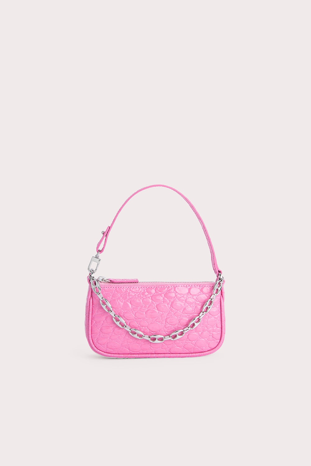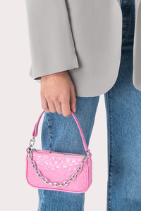 Playing with proportions, BY FAR reintroduced its iconic shape into a compact mini version. The top-handled bag stands out for its sleek lines and custom chain, inspired by vintage jewellery. Made of croco embossed leather, a distinctive motif of the brand, this accessory can fit small essentials, including a phone. DETAILS • Cowhide leather exterior • Nickel-Free Hardware • Leather handle with snap hook • Custom-made chain • Zip closure • Cotton lining • iPhone-friendly • Made in Bulgaria CARE At BY FAR we carefully select all materials used for our products. Please handle with care for longer product life. • Avoid use in very humid conditions • Do not use solvents and excessive or prolonged rubbing, as this could damage the product • Clean with a soft, dry cloth • Store your BY FAR product in its original dust bag You can find more information at Product Care. SIZE AND FIT • Depth 2.5 cm • Height 9.5 cm • Width 19 cm • Handle Drop 14 cm • Strap Length 35 cm