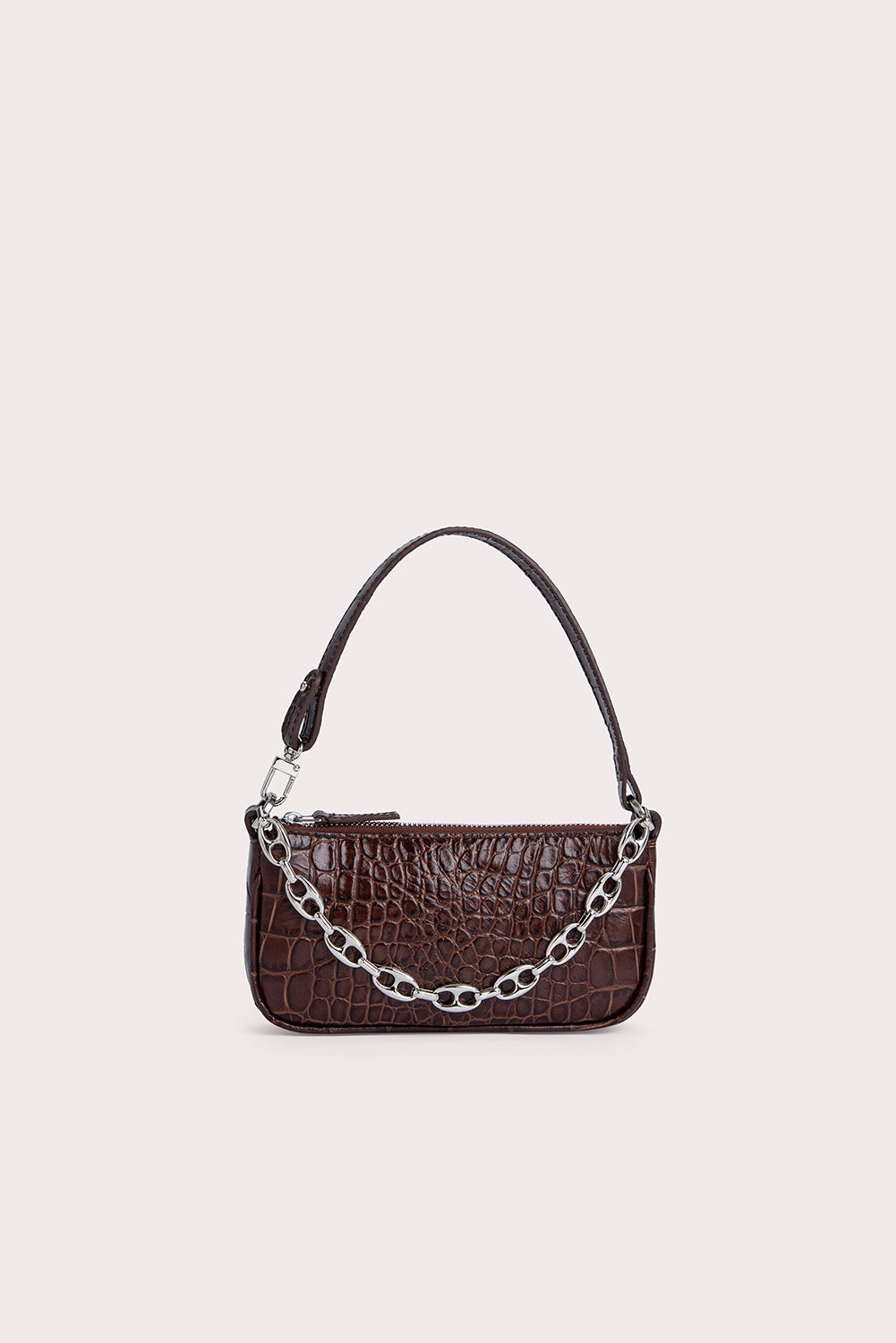Playing with proportions, BY FAR reintroduced its iconic shape into a compact mini version. The minimalist silhouette stands out for its sleek lines and the custom silver-toned chain on the front, inspired by vintage jewellery. MINI RACHEL can fit just the essentials, including a phone. The feminine appeal of the style is further enhanced by the croco embossed leather, a signature material for the brand.