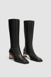 Fitted lamb nappa leather knee-high boot with internal side zip and elasticated topline panel. Features a sculpted 5.5cm leather-covered block heel, decorative vertical stitchlines, an elongated square toeshape, and a leather sole. DETAILS - Leather knee high boot - Fitted - Internal side zip closure - Internal elasticated panel at topline - Sculpted leather-covered block heel - Heel height: 5,5 cm - Decorative vertical stitchlines - Elongated square toeshape - Leather sole - Made in Bulgaria SIZE AND FIT Fits true to size. Italian/European sizing.
