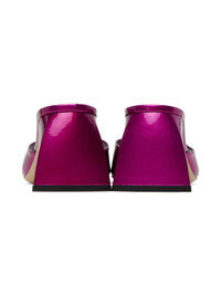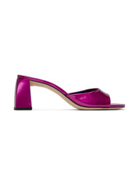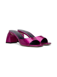 Patent leather heeled sandals in metallic pink. · Open square toe · Logo embossed at padded footbed · Covered block heel with rubber injection · Suede sole · Heel: H2.5" Supplier color: Fuchsia Upper: leather. Sole: leather, rubber. Made in Portugal 232289F125030