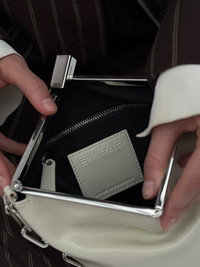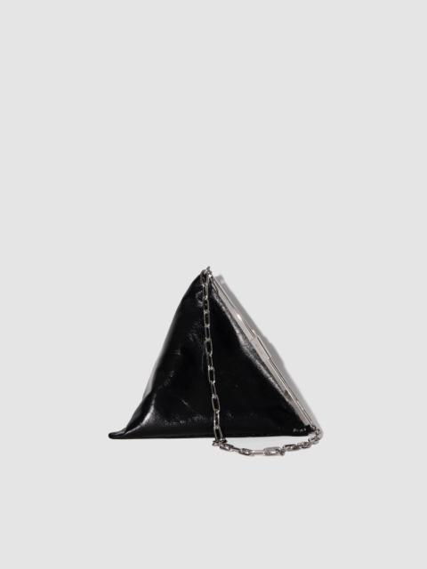 Creased leather top-handle bag with a pyramid construction and a detachable chain strap for versatile wear. Features a silver-toned folding frame, clasp fastening with BY FAR logo, inside zip pocket, and synthetic suede lining. Made from LWG certified leather. DETAILS - Leather top-handle bag - Crafted in shiny Italian lambskin with creased effect - Pyramid construction - Detachable chain strap for multiple ways to wear - Silver-toned kiss-shaped frame that folds for enhanced functionality - Clasp fastening with BY FAR logo - Inside zip pocket - Synthetic suede lining - Offered in creased leather for a soft, sculpted look - Made in Bulgaria SIZE AND FIT Width: 25 cm Height: 20 cm Depth: 26 cm 53 cm chain