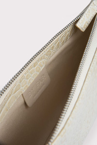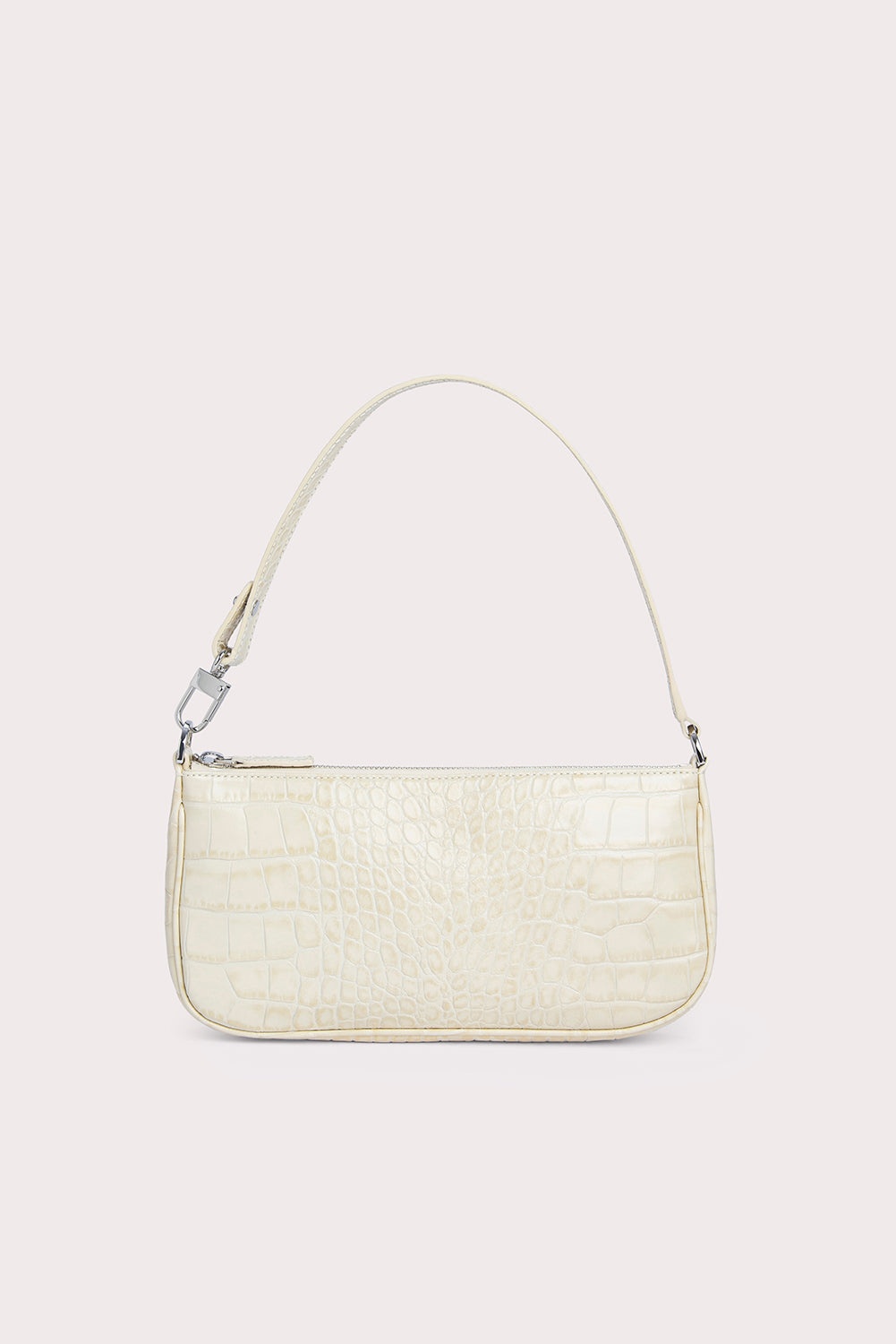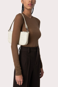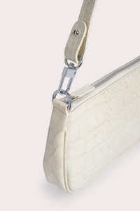 BY FAR’s definitive shoulder bag silhouette embodies nineties inspiration reimagined in a contemporary way. Characterized by a minimal pochette shape, its balanced proportions are designed to fit all the essentials while elegantly complementing the body. Crafted in croco embossed leather – a signature for the brand – the style is adorned with delicate silver-toned hardware. DETAILS Leather shoulder bag Croco embossed leather Material: 100% European cowhide leather Leather handle Silver-toned metal hardware Zip closure Edge-painted detailing 100% cotton lining Available in a smaller version Made in Bulgaria CARE At BY FAR we carefully select all materials used for our products. Please handle with care for longer product life. • Avoid use in very humid conditions • Do not use solvents and excessive or prolonged rubbing, as this could damage the product • Clean with a soft, dry cloth • Store your BY FAR product in its original dust bag You can find more information at Product Care. SIZE AND FIT • Depth 4 cm • Height 13.5 cm • Width 28.5 cm • Maximum Strap Length 47 cm