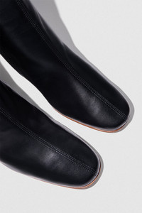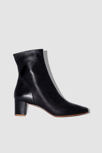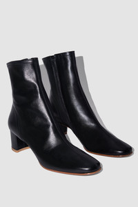 Leather ankle boots with a glove-like fit and a 5 cm leather-covered block heel. Designed with an internal side zip, elongated square toe, and delicate decorative seaming. Made from LWG-certified leather. DETAILS - Leather ankle boots - Material: 100% Italian cowhide leather - Leather covered block heel - Heel Height: 5 cm - Shaft height: 5 cm (for size 39, measurements adjust by 0.2cm every size) - Ankle circumference: 23.5cm (for size 39, measurements adjust by 0.5cm every - Made in Bulgaria - Side zip closure - Rounded toe SIZE AND FIT Fits big to size. Take one size smaller than normal. Italian/European sizing.