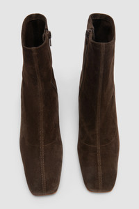 Suede leather ankle boot with a glove-like fit and a 3 cm leather-covered block heel. Featuring an internal side zip, delicate central seaming, and a rounded toe. DETAILS Leather ankle boot - Unlined upper; glove-like fit - Leather-covered block heel - Heel height: 3 cm - Internal side zip - Elongated square toe - Delicate decorative seaming - Made in Bulgaria SIZE AND FIT Fits true to size. Italian/European sizing