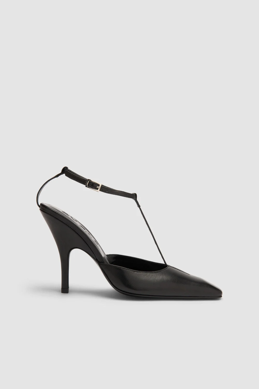 T-strap lamb nappa leather high heel pump with a closed elongated square toe and strappy construction. Features a thin tubular T-strap with stitched raised detailing, a 12cm leather-covered heel, adjustable ankle strap, and finished with a leather sole. DETAILS - T-strap high heel pump - Closed toe, stappy construction - Thin tubular T-strap with stitched raised upper detail - Leather-covered heel - Heel height: 12cm - Adjustable ankle strap - Elongated narrow square toe - Leather sole - Made in Bulgaria SIZE AND FIT Fits true to size. Italian/European sizing.