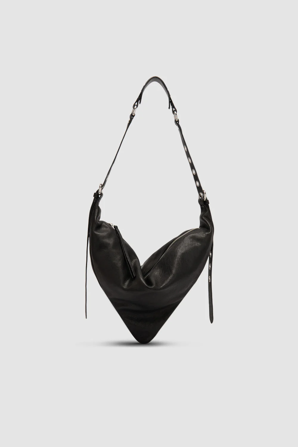Soft triangular leather bag featuring adjustable leather straps for shoulder or crossbody wear. Finished with a zip closure, divided main compartment, bottom belt detail, metal hardware, and a branded leather patch inside, all lined with micro suede. DETAILS - Soft triangular construction - Adjustable leather straps - Option to wear it as shoulder bag or as a crossbody bag - Zip closure - Big interior compartment divided in two halves - Belt detail across the bottom - Metal hardware - Small interior branded leather patch 63x 56mm - Micro suede lining - Made in Bulgaria SIZE AND FIT - Height: 35 cm - Width: 64 cm - Handle Drop: 57 cm - Strap Total Length: 146 cm