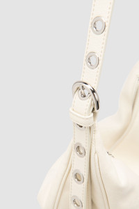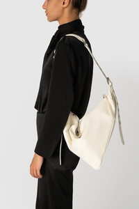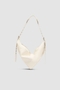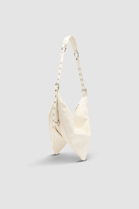 Soft triangular leather bag featuring adjustable leather straps for shoulder or crossbody wear. Finished with a zip closure, divided main compartment, bottom belt detail, metal hardware, and a branded leather patch inside, all lined with micro suede. DETAILS - Soft triangular construction - Adjustable leather straps - Option to wear it as shoulder bag or as a crossbody bag - Zip closure - Big interior compartment divided in two halves - Belt detail across the bottom - Metal hardware - Small interior branded leather patch 63x 56mm - Micro suede lining - Made in Bulgaria SIZE AND FIT - Height: 35 cm - Width: 64 cm - Handle Drop: 57 cm - Strap Total Length: 146 cm