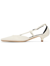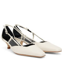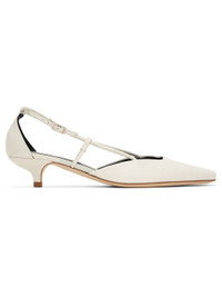 Polished lambskin heels in white. · Pointed square toe · Straps at sides · Pin-buckle fastening at outer side · Logo embossed at padded leather footbed · Covered kitten heel with rubber injection · Polished leather sole · Heel: H1.5" Supplier color: Limewash Upper: lambskin. Sole: leather. Made in Portugal 242289F122005