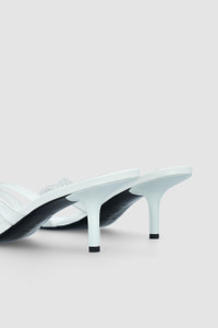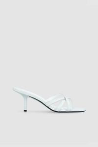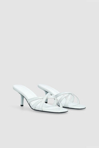 Creased calf leather mules with a thin painted 7 cm heel and crossed leather straps. Finished with a rounded almond toe. Made from LWG-certified leather. DETAILS - Leather sandal - Painted flared heel - Heel Height: 10 cm - Three crossed leather straps - Leather ankle strap with buckle fastening - Contrast insole - Pointy sandal toe - Made in Bulgaria SIZE AND FIT Fits true to size. Italian/European sizing