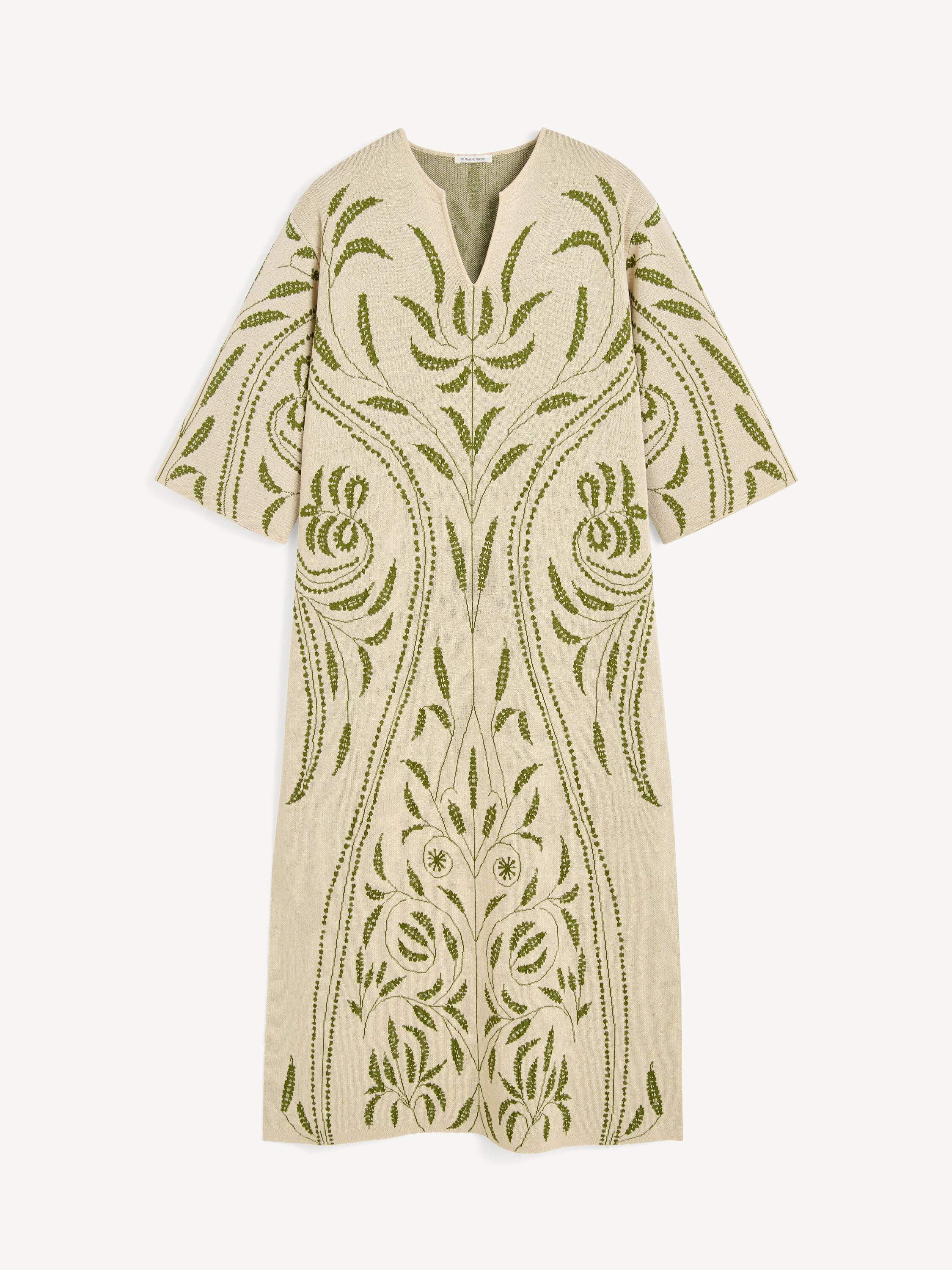 With inspiration from tranquil gardens, the Agneto dress is covered in embroidered grasshopper green garden vines. The close-knitted maxi design has a deep V-neck, wide sleeves and high slits on each side. Wear on its own or with the matching Jorith trousers. - Loose fit - Model is 179 cm and is wearing a size S - V-neck - High slits - Embroidered pattern - Contains LENZING™ ECOVERO™ viscose fibers - "LENZING™ and ECOVERO™ are trademarks of Lenzing AG DETAILS COLOUR Garden Jacquard COMPOSITION 87% viscose (lenzing (TM) ecovero (TM) ), 13% polyamide CARE Delicate machine wash at 30°c PRODUCT CODE Style #103472QJ2