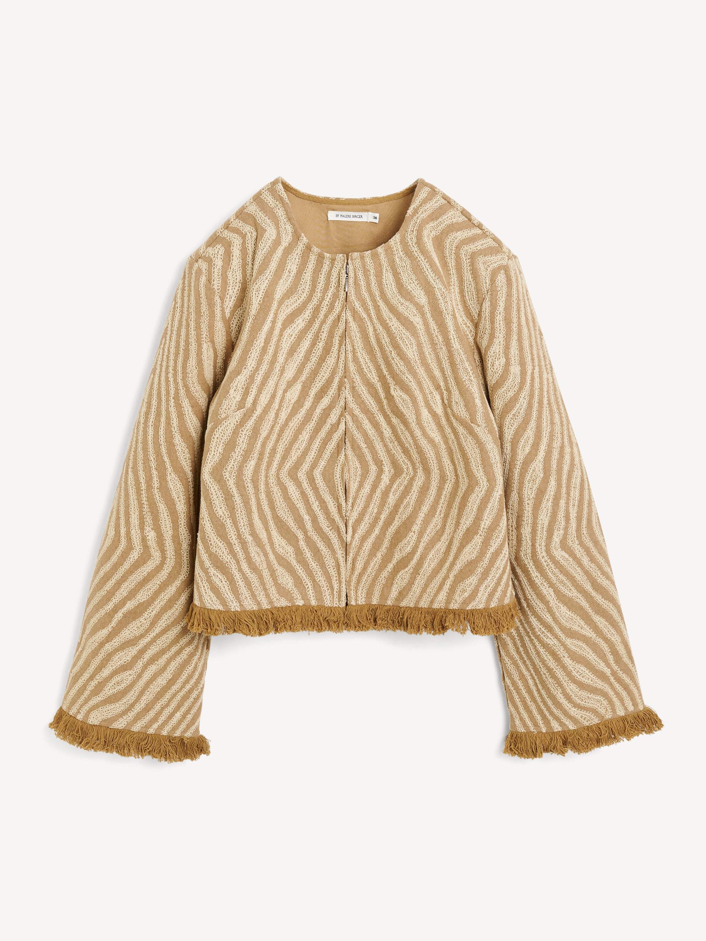 Considered design details and a tactile fabrication in rich caramel sets the Akello jacket apart. With hand-embroidered animal printed details, the wool-blend design is set on a boxy, slightly cropped silhouette with plush fringes at the hems. Complete the sleek design by pairing with the matching Arvine top and Giabbo skirt. - Regular fit - Model is 178 cm and is wearing a size 36 - Expected Arrival: December 2024 - Zip closure - Cropped length - Fringe details - Fully lined - Hand-embroidered DETAILS COLOUR Zebra Print COMPOSITION 75% wool, 25% polyamide CARE Dry clean only PRODUCT CODE Style #103141QZ2