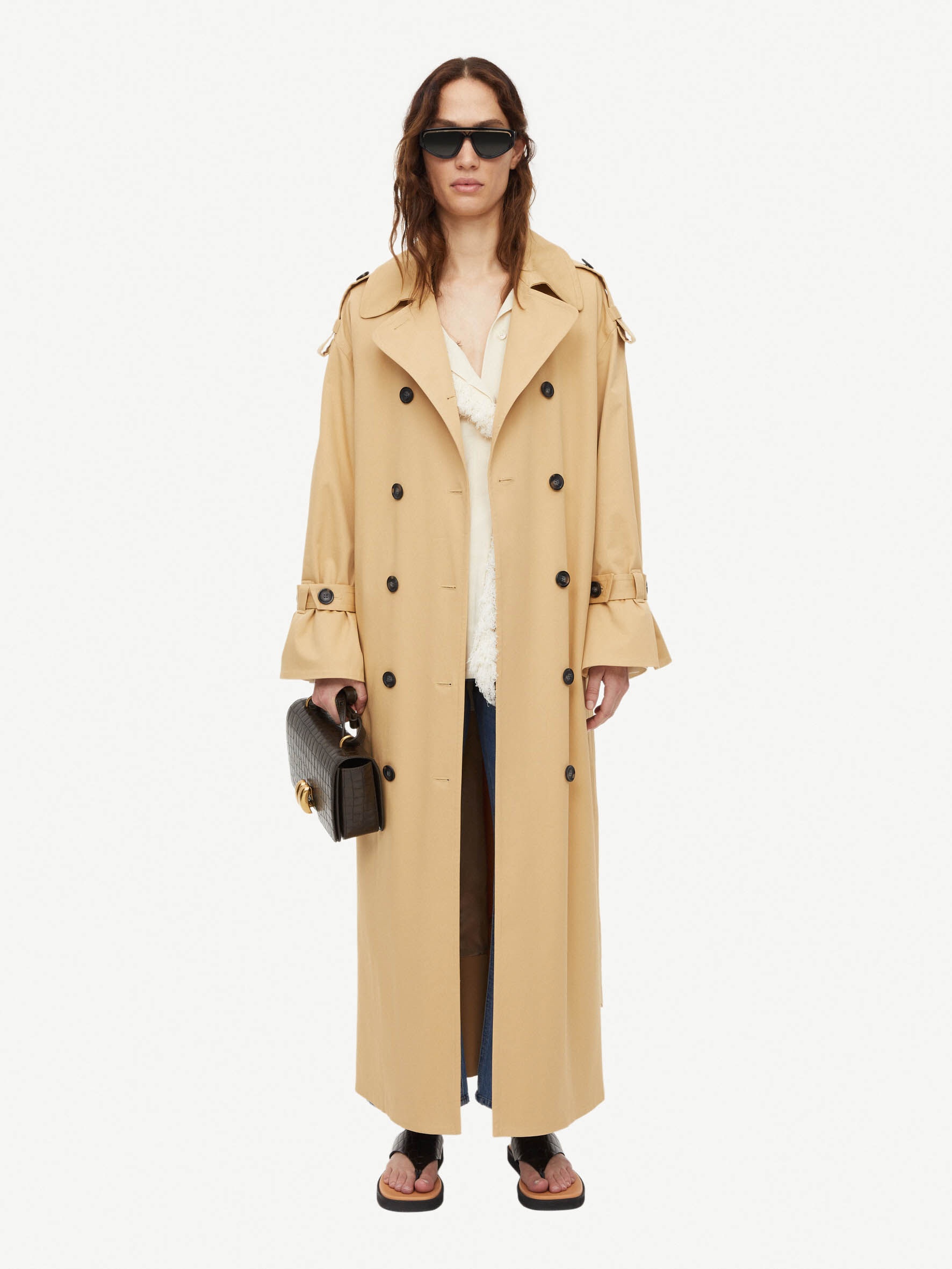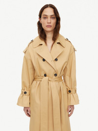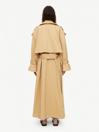 The Alanis trench coat is the key to effortless transitional dressing. Crafted from cotton twill, this double-breasted design has classic trench coat features: epaulettes at the shoulders, notched lapels and buckled sleeve straps. Cinch yours with the adjustable belt or loosely layer over summer outfits. - Oversized fit - Designed with an oversized fit, so we recommend you take your own size for the intended fit or one size down for a more classic fit - Double-breasted - Adjustable belt DETAILS COLOUR Sand Beige COMPOSITION 50% cotton organic, 48% cotton, 2% elastane CARE Dry clean only PRODUCT CODE Style #1018991L3