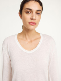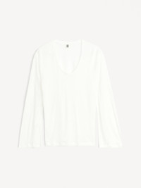 By Malene Birger Amalou top made from a soft blend of Lyocell and linen. It is designed with a regular fit, long sleeves, and a curved neckline to draw attention to the chest. Style it with leather trousers to wear from work to vernissage. - Regular fit - Model is 175 cm and is wearing a size S - Curved neckiline - Long sleeves - Contains TENCEL™ Lyocell fibers - TENCEL™ is a trademarks of Lenzing AG DETAILS COLOUR Soft White COMPOSITION 70% lyocell (tencel (TM)), 30% linen CARE Delicate machine wash at 30°c PRODUCT CODE Style #10190603Z