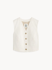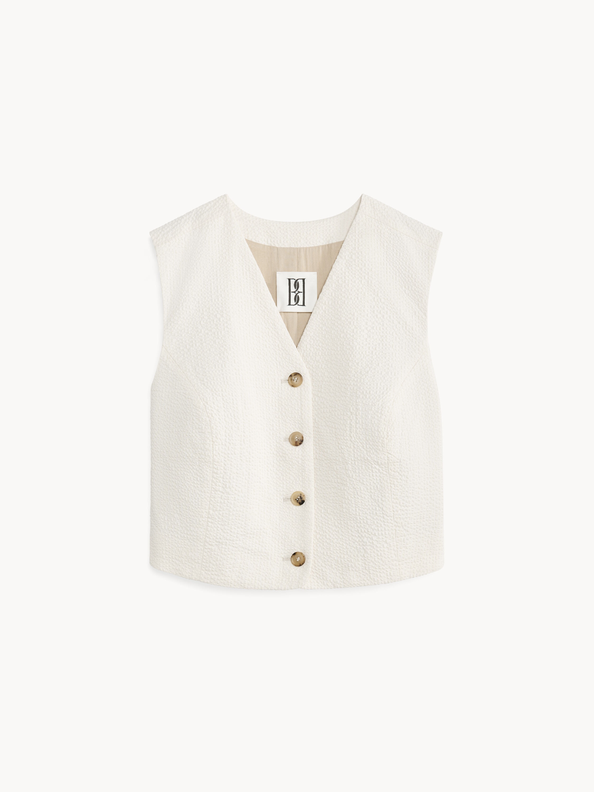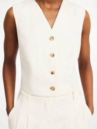 Masculine in style and feminine in fabrication, the Blaire waistcoat is the ideal layering piece. The single-breasted design fastens with a row of buttons down the front and features an adjustable buckle in the back. Pair with the matching Ophie blazer and Cymbaria trousers for the office. - Tight fit - Model is 174 cm and is wearing a size 36 - Single-breasted - Button closure - Adjustable back buckle DETAILS COLOUR Soft White COMPOSITION 98% cotton organic, 2% elastane CARE Delicate machine wash at 30°c PRODUCT CODE Style #10223803Z