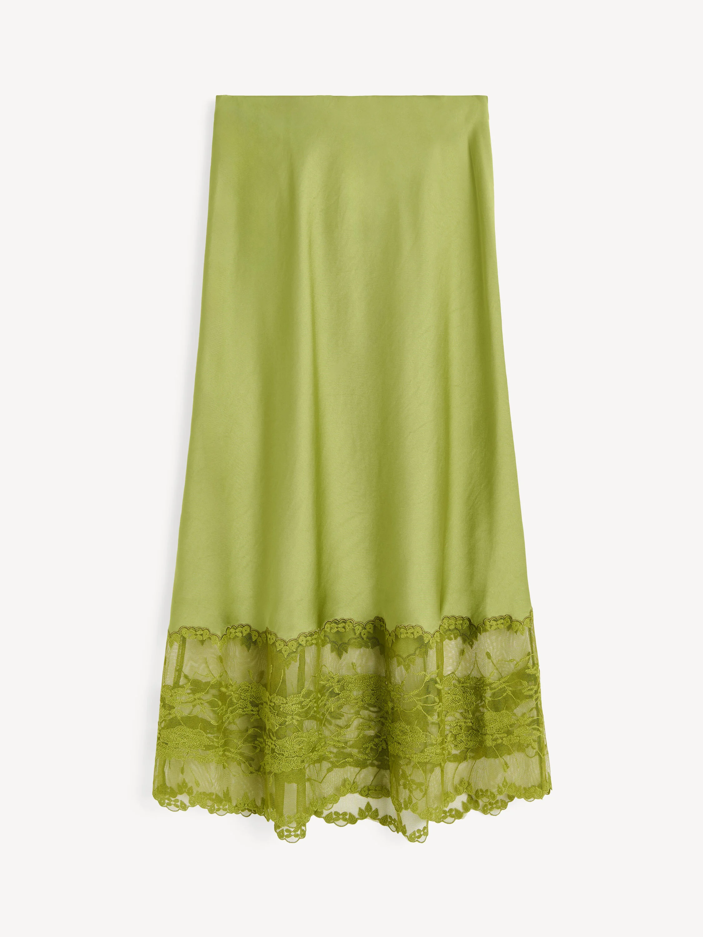 Add a sense of modern bohemia to your year-round wardrobe with the Blake skirt. The maxi design is made in satin and decorated with a delicate lace at its bottom. Equally wearable for festive occasions with the Leeba top or workdays with a casual sweater, it will be a favourite for seasons – and years – to come. - Regular fit - Model is 179 cm and is wearing a size 36 - Lace detailing - Elastic waistband - A-line silhouette - Unlined - Eastman Naia™ is a cellulosic fibre produced from responsibly sourced wood pulp. It is quick drying, biodegradable, supremely soft and comfortable to wear DETAILS COLOUR Grasshopper COMPOSITION 76% acetate, 24% polyester CARE Delicate machine wash at 30°c PRODUCT CODE Style #1034044Z8