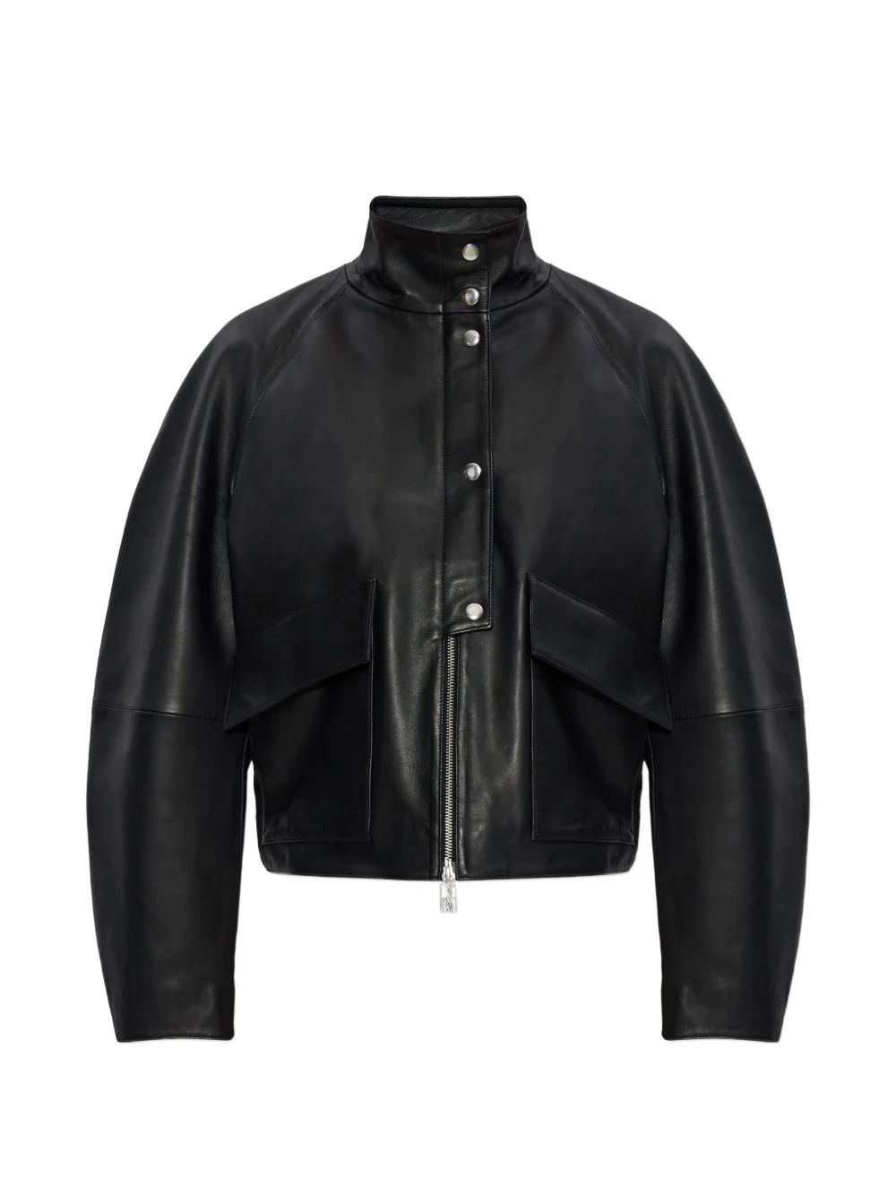 button flap jacket Highlights - Black - Silver-tone hardware - Front zip fastening - Stand-up collar - Front flap pockets - Gathered rear Imported Composition Outer: Lamb Skin 100%
