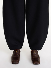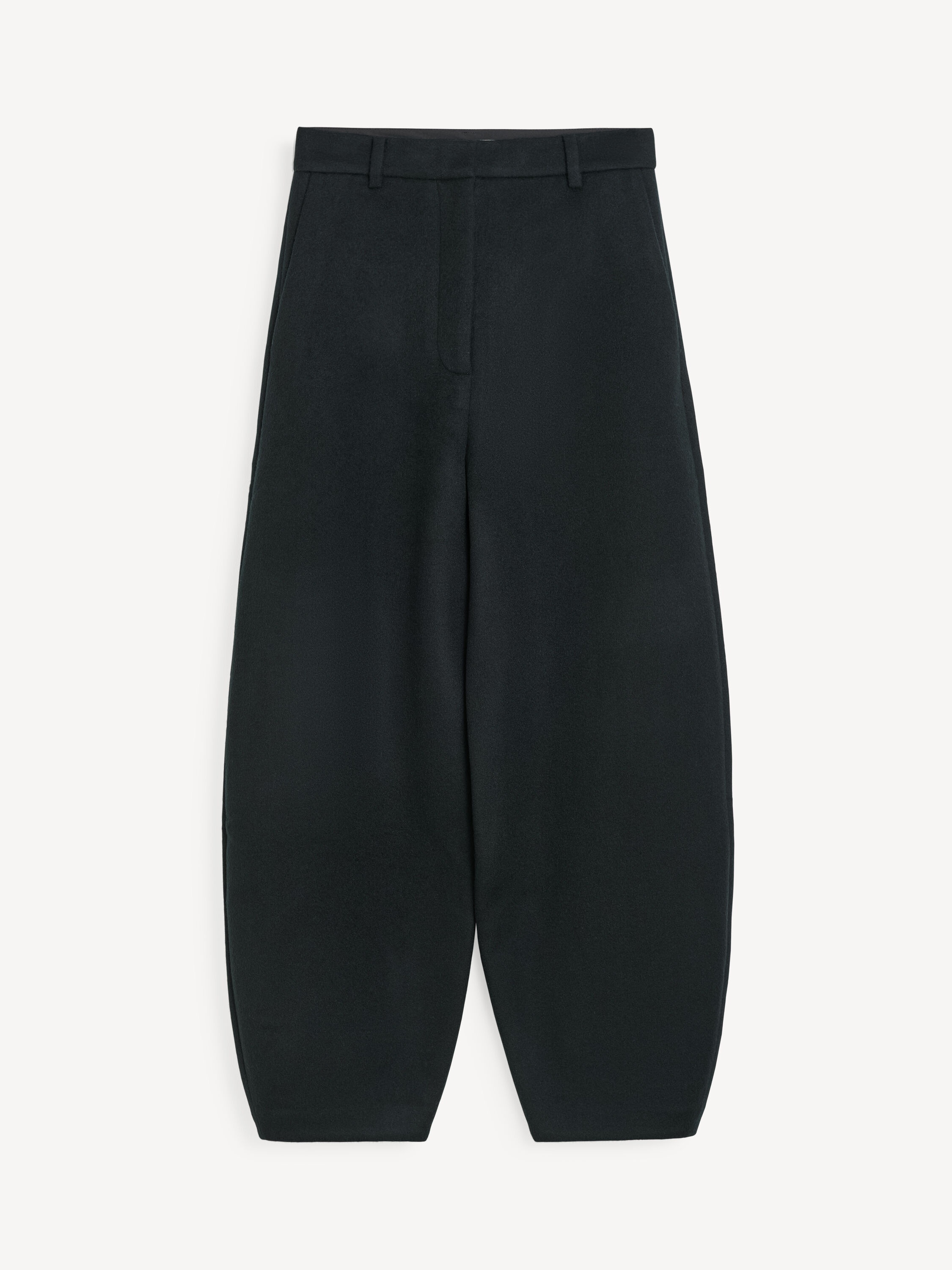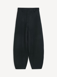 By Malene Birger Carlien trousers tailored to a barrel silhouette with pressed creases. They have a high waist, belt loops, side pockets, and a hook and zipper fastening. Style them with a classic shirt for a modern take on office wear. - Regular fit - Model is 173 cm and is wearing a size 36 - This product contains 100% RWS wool, certified by Control Union, CU 877742. The Responsible Wool standard (RWS) verifies animal welfare and land management requirements and tracks it from the source to the final product. - Tapered leg - Belt loops - Side pockets DETAILS COLOUR Black COMPOSITION 100% wool CARE Dry clean only PRODUCT CODE Style #102344050