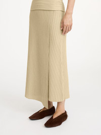Cassila midi skirt knitted from merino wool to a regular fit. It is designed with an elastic waistband and an overlapping wrap design. Add a poncho and brooch to add a bohemian feel. - Regular fit - Model is 178 cm and is wearing a size S - This product contains 100% RWS wool, certified by Control Union, CU 877742. The Responsible Wool standard (RWS) verifies animal welfare and land management requirements and tracks it from the source to the final product. - Elastic waistband - Wrap design DETAILS COLOUR Old Beige COMPOSITION 100% wool - merino CARE Hand wash PRODUCT CODE Style #1015881Y4