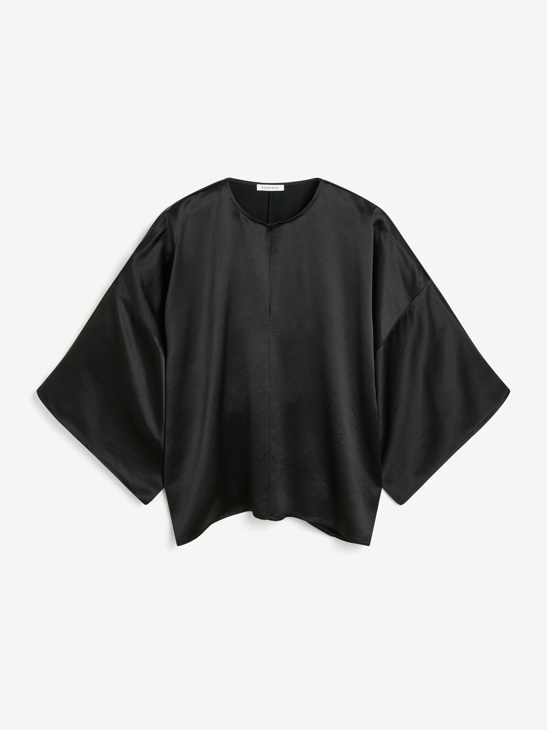 Sophistication and ease define the Cicie blouse. Made to add elegance to work- and eveningwear alike, the satin design has dropped shoulders, wide cropped sleeves, and a deep neckline that can be closed with a discreet clasp. - Oversized fit - Model is 178 cm and is wearing a size 36 - Dropped shoulders - Wide sleeves - Low neckline - Clasp closure - Eastman Naia™ is a cellulosic fibre produced from responsibly sourced wood pulp. It is quick drying, biodegradable, supremely soft and comfortable to wear DETAILS COLOUR Black COMPOSITION 76% acetate, 24% polyester CARE Delicate machine wash at 30°c PRODUCT CODE Style #102500050