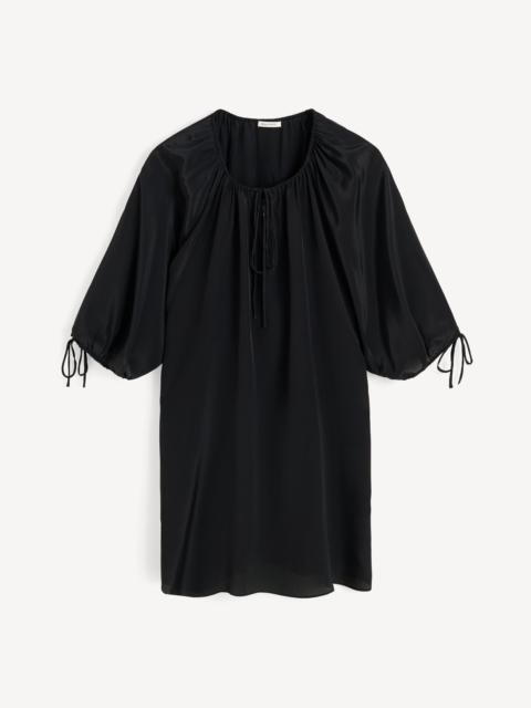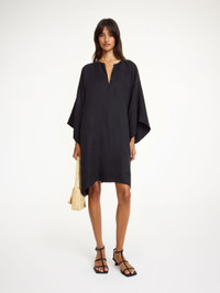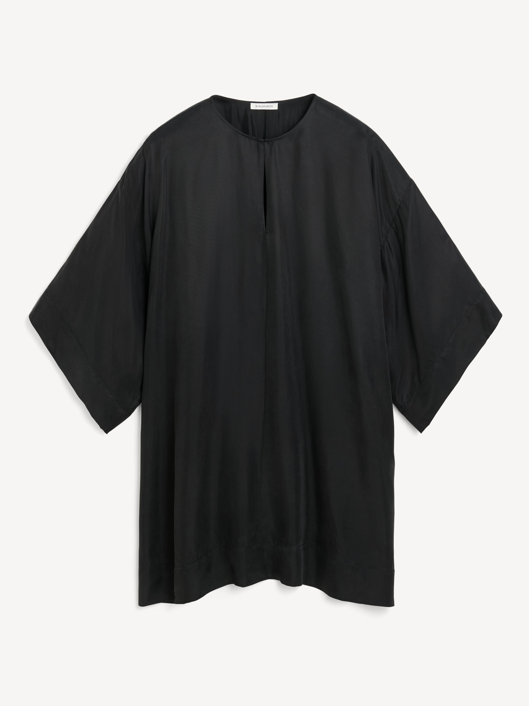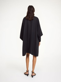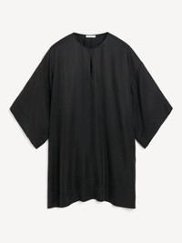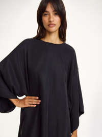 Equally easy to wear and to style, the Cime midi dress is made in a smooth and elegant cupro mix. The square silhouette with cropped sleeves has a deep neckline – to be left open or closed depending on your mood. Wear it over the Mirabello trousers for a layered look that works across seasons. - Oversized fit - Model is 175 cm and is wearing a size 36 - Wide sleeves - Deep neckline - Hook closure - Dropped shoulders DETAILS COLOUR Black COMPOSITION 57% cupro, 43% viscose CARE Delicate machine wash at 30°c PRODUCT CODE Style #103448050