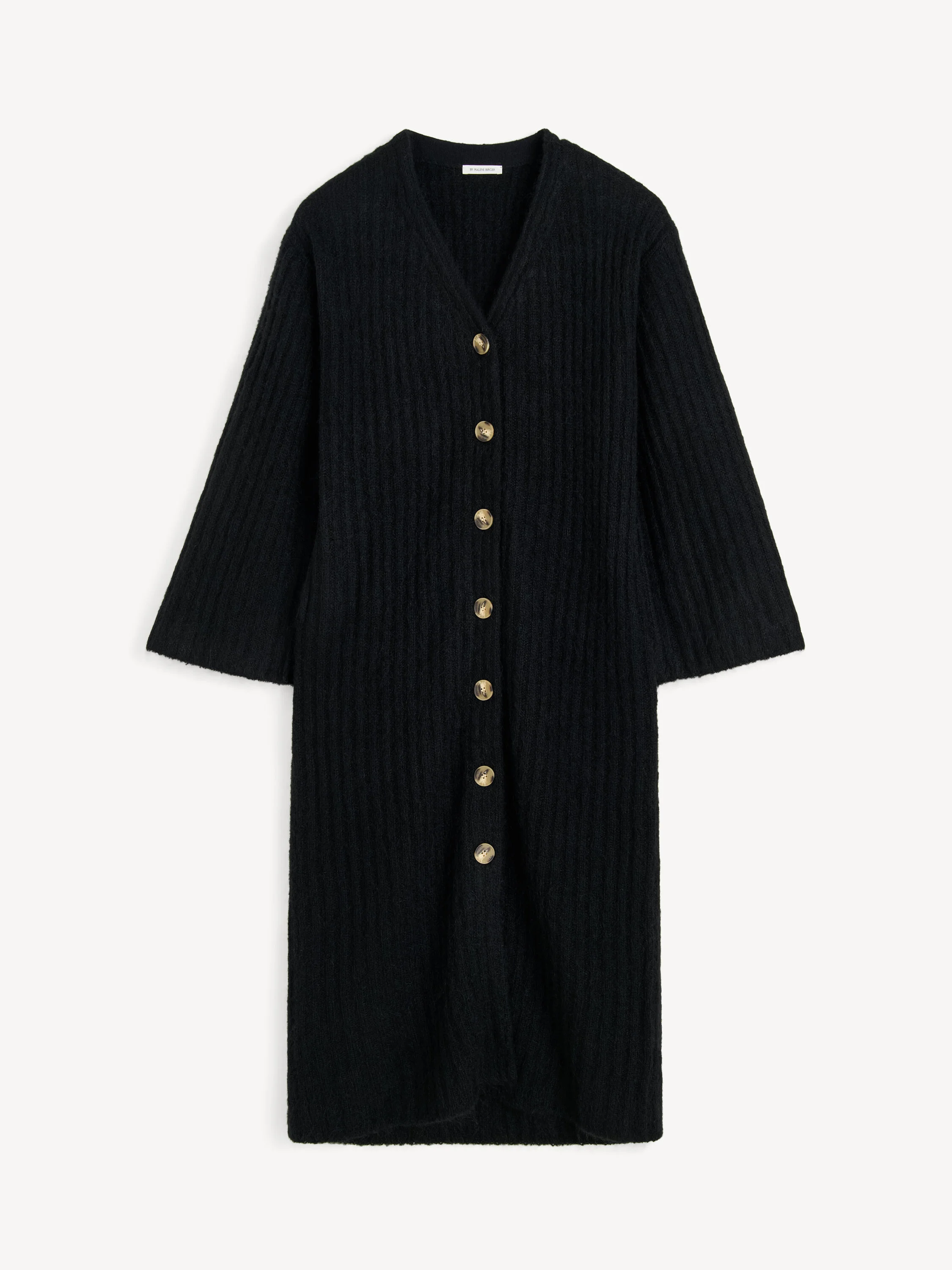 Designed in a neutral hue that works with everything in your wardrobe, the Cimonello cardigan is made from a warm wool and mohair mix. Its classic button closure and V-neck contrast the bold maxi silhouette. Use as a versatile layer or as a snug maxi dress. - Loose fit - Model is 178 cm and is wearing a size S - Buttoned closure - V-neck - Rib fabrication - Dropped shoulders - This product contains 49% RWS wool and 30% RMS mohair, certified by Control Union, CU 877742. Responsible Mohair Standard (RMS) & Wool standard (RWS) verifies animal welfare and land management requirements and tracks it from the farm to the final product DETAILS COLOUR Black COMPOSITION 49% wool, 30% mohair, 21% polyamide CARE Hand wash PRODUCT CODE Style #103207050