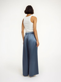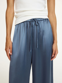 With its lustrous fabrication and care-free silhouette, the Clorella design works equally for day- and nighttime. Inspired by the classic pyjamas, the wide-leg trousers have an elastic waistband with adjustable ties, completed with side pockets. - Loose fit - Model is 175 cm and is wearing a size 36 - Wide legs - Elastic waistband - Adjustable ties - Side pockets - Eastman Naia™ is a cellulosic fibre produced from responsibly sourced wood pulp. It is quick drying, biodegradable, supremely soft and comfortable to wear DETAILS COLOUR Grisaille COMPOSITION 76% acetate, 24% polyester CARE Delicate machine wash at 30°c PRODUCT CODE Style #103309056