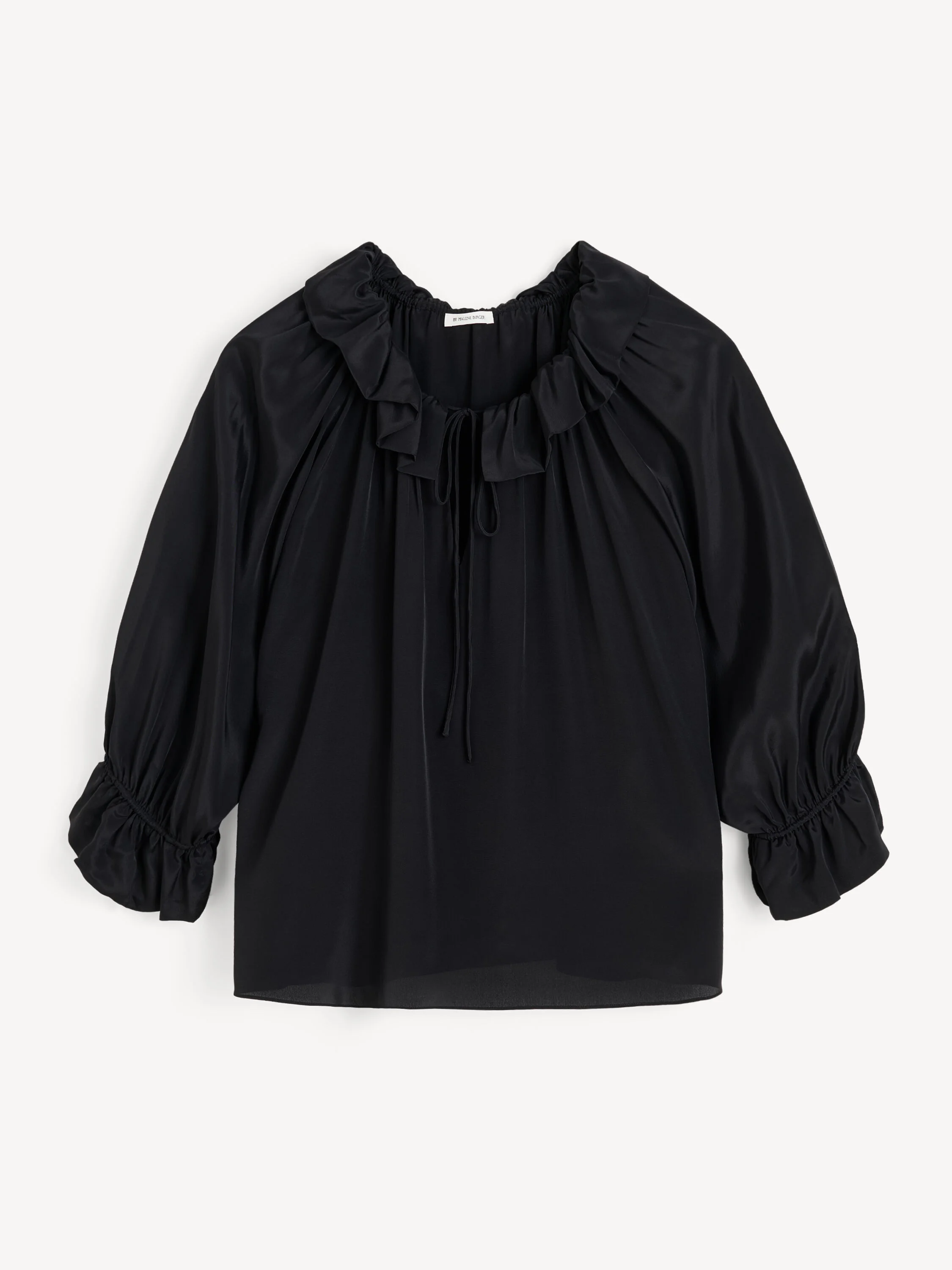 Every wardrobe needs a feminine and eclectic blouse – such as the Dicte design – that will take you from the office to the after-hours without any fuss. Detailed with ruffles across both collar and cuffs, and a V-neck with adjustable ties, the billowing silhouette works with tailored trousers and sinuous skirts alike. - Loose fit - Model is 177 cm and is wearing a size 36 - Ruffled collar - V-neck - Tie closure - Ruffled cuffs DETAILS COLOUR Black COMPOSITION 70% viscose, 30% silk CARE Hand wash PRODUCT CODE Style #103673050