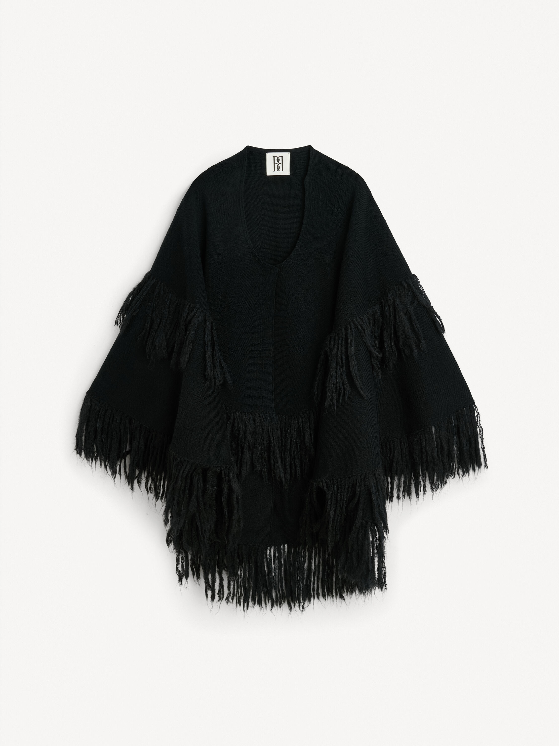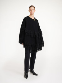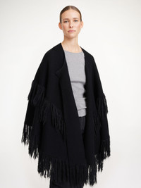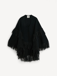 By Malene Birger Dixi poncho knitted from heavy wool in a classic A-line design. It closes at the front and is accented by two rows of tonal fringes. Add a golden brooch for a touch of refinement. - Oversized fit - Model is 178 cm - This product contains 98% RWS wool, certified by Control Union, CU 877742. The Responsible Wool standard (RWS) verifies animal welfare and land management requirements and tracks it from the source to the final product - Curved neck - Fringes DETAILS COLOUR Black COMPOSITION 98% wool, 2% elastane CARE Hand wash PRODUCT CODE Style #101583050